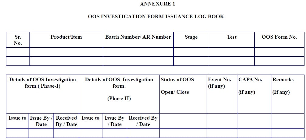 - Register the Out of Specification (OOS) details in out of specification investigation form issuance logbook as per the SOP.